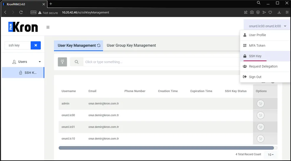 to enable this feature, the user needs to navigate to the ssh key manager screen to generate a new public and private key admins can manage user group authorizations for passwords and ssh keys to generate new public and private keys navigate to user management > ssh keys management click the generate new key pair tab a pop up window will open with the choices a) download public key, b) download private key, and c) copy to clipboard to upload the public key navigate to user management > ssh key manager click the upload public key tab copy paste a public key into the open window and click save if an ssh key is not used to log in to the kron pam ssh proxy, the uploaded public key must be deleted by following the steps below navigate to user management > ssh key manager click the remove public key tab click yes on the open confirmation pop up window