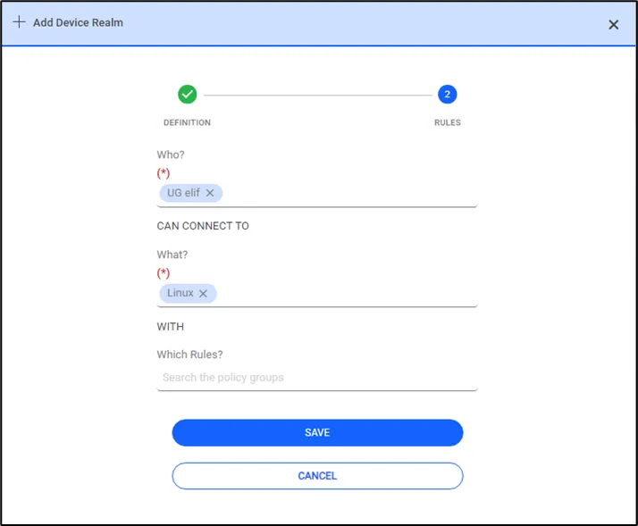 device group realms bind user groups with device groups so that the users in that user group can reach the devices defined in the device group to create a new device group realm navigate to policy> realms click on the +add button fill out the device realm name and description fields and click next start typing the user group name in the user group select field, and click on the desired result from the auto complete alternatives start typing the device group name in the device group select field, and click on the desired result from the auto complete alternatives (optional) start typing the policy group name in the policy group select field, and click on the desired result from the auto complete alternatives click save you created a new device realm by matching a device group with a user group when a user logs in to kron pam , the menu screens to be used are not displayed if there is no defined portal functions realm for the user’s user groups after creating the device realm, the portal functions realm should be defined between the user groups and the netright discovery modulevisibility portal function, so that users can access devices in the created device group from the portal menu screen see also docid\ yhj9mpw 3j euwih r9o