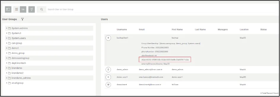 every active directory user has a unique id, and any configuration made for the user is bound with this unique id therefore, object guid information from the ldap is located in a column that the user accounts page when a username changes on the ldap, it is also changed in kron pam t according to objectguid therefore, audit logs, activity logs, and session logs can be followed easily in case the username changes on the source username changes are available on the user group properties to see user information changes on the ldap navigate to users > choose the group of user then users wiil be listed click green arrow button on the user click on the user history if more than one domain exists on kron pam , users are able to select a domain on the web gui page by configuration navigate to system config manager set the show\ sc portal login domain as true save this property