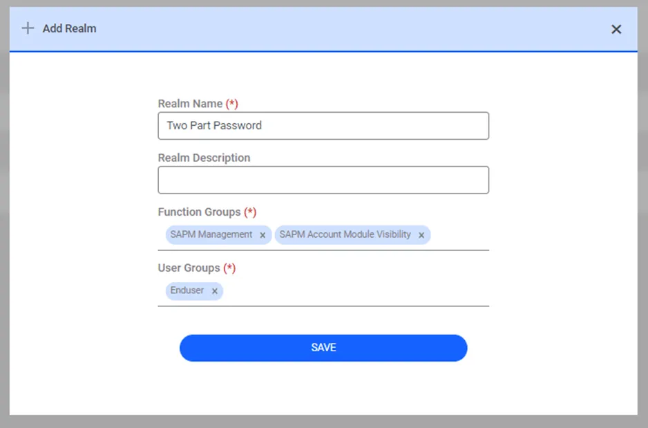to secure the two part approval process, account passwords can be split in two and each part retrieved by different users after placing the users in different user groups, follow these steps navigate to policy > realms click on to add button create the device group realm between the user groups (who?) and the device group (what?) containing the target device and save navigate to secrets> vault search for the account click the account options button select permissions to open the permissions pop up window define the read only first part permission type for the user group that will receive the first part of the password define the read only second part permission type for the user group that will receive the second part of the password close the permissions pop up window navigate to policy > portal functions create a portal realm with the sapm management, and sapm account module visibility function groups for both user groups after completing these steps, the users log in and retrieve their parts of the password from the vault section, just like with normal password retrieval they can log in to the target system using the account username and the password combined in the correct order if one or two level approval applies to the user, the user will receive the password part via email, once the approval process is completed
