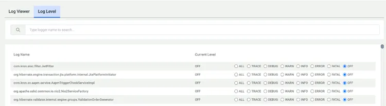 system logs can be monitored on the kron pam web gui in this menu, users can see the system logs created by kron pam itself, allowing the users to easily track any problem that occurs the application logs under each component represent the module log proxy logs for each component are named using the component and proxy name proxy means using a middle point for connection the logs associated with each component can be seen if the related checkboxes are checked navigate to administration > system log viewer multiple screens can be opened by clicking the new screen button the logs to be monitored are selected from the streams section, on the left side filters can also be applied to these logs log levels can be changed from the log level window click the change log levels link button and change or select the desired log level
