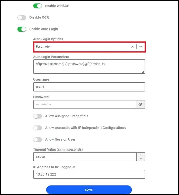 the command line argument is a kind of parameter supplied to the program when it is invoked some applications can receive/take parameters from the command line these kinds of applications are configurable with appropriate parameters from kron pam so, we can start, by calling these applications with parameters kron pam executes these kinds of applications with preconfigured parameters through the rdp protocol hence all the information, including the sensitive data, is transmitted inside the rdp protocol securely to configure the parametric solution navigate to devices > inventory > device groups select the device group you want to edit and select remote apps set the enable auto login click the auto login options button and fill in the required fields with the information shown in the image above select auto login options as a parameter and then configure it accordingly the figure above shows that the winscp application receives some parameters such as username, password, and device ip this syntax is specific to the winscp application other applications can have similar syntaxes, so we can define the applications’ parameters and fill in the necessary fields as we do in the ocr section ocr and parametric solutions use a common screen, and configurations are the same