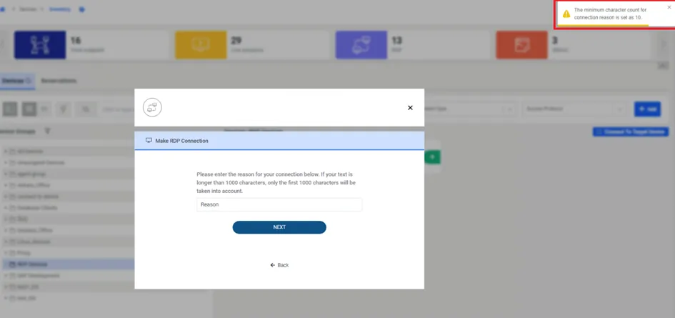 a reason field can be enabled to be completed by users when they are connecting to devices the text entered as the reason for the connection appears in the session logs and the managerial approval request emails and notifications to enable this feature, the require user to enter a reason for connection property must be set as true on the device group that includes the target devices log in to the kron pam web gui navigate to devices > inventory choose the desired device group, and select edit connection approval methods set the require user to enter a reason for connection property as true according to regulations, it is mandatory to provide a justification for why a connection is being established during each connection setup this requirement ensures traceability, accountability, and compliance with security and auditing standards, minimizing unauthorized or unclear access to sensitive systems if you want to set a minimum character limit for the reason required for the connection, follow these steps to define the limit log in to the kron pam web gui navigate to system configuration manager > add > add new system parameter add the parameter " rdp min reason character limit " this value can be set to 5 or greater navigate to devices > inventory choose the desired device group, select edit connection approval methods set the require user to enter a reason for connection property as true