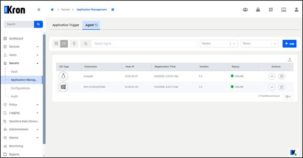 the vault agent is a deployable service that can be installed directly on application servers or within kubernetes pods this agent ensures that credentials remain locally accessible even in environments with intermittent network connectivity it securely communicates with the password vault to retrieve credentials based on the application identity and authorization policies on linux and windows servers, the agent operates as a service, allowing applications to access kron pam using sdks connected to the agent agents function based on licensing and are listed under the secrets > application management section on the agent screen to install the agent in a new environment click the add button on the agent screen to generate a new register key the agent installation is then performed on the respective server or pod using the register key